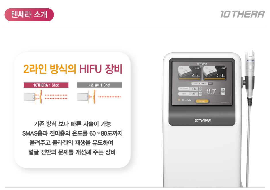 텐쎄라 리프팅은 초음파 에너지를 이용해 피부 깊은 층까지 자극을 주어 콜라겐 생성을 촉진하고, 탄력을 회복시키는 비수술 리프팅 시술입니다.